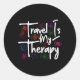 El diseño "Viajes es mi terapia" presenta sellos de pasaporte de viajero mundial de varios países, que evocan una sensación de pasión por el mundo, aventura y exploración global.