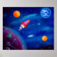 Esta impresión de alta calidad de mi pintura acrílica original, "Viaje Espacial", presenta a un niño y su gato en su increíble viaje espacial en un cohete rojo… Una decoración perfecta para cualquier habitación de niños. | 2014 Amazing Journey Art, www.amazingjourneyart.com
