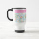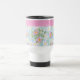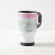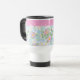 Una taza de viaje sin derrame para personalizar, con un patrón nostálgico de dogroses rosados sobre un fondo azul cielo; de la colección Posh & Painterly 'Rosy Posy'.