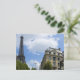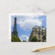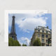Cielo azul y nubes onduladas sobre edificios de apartamentos de lujo bajo el icono de París, la Torre Eiffel.