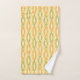 A vibrant geometric pattern with hexagonal shapes outlined in orange and teal on a soft yellow background, creating a retro, rhythmic visual effect.