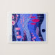 This modern customizable puzzle features a vibrant, stylized landscape with a whimsical and modern aesthetic. A rich color palette of deep blues, pinks, and purples to create a layered, multi-dimensional scene, with birds, fish and colorful trees and plants.