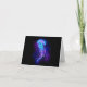 Gran medusa azul, de dibujo artístico, brillante y brillante, con largos tentáculos sobre fondo negro con bioluminiscencia violeta. Luminosas medusas.