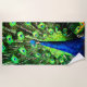 Pon tus cosas en la playa mientras te colocas en esta GORGEOSA toalla de playa de colores vivos que muestra este retrato de un pavo real, puliendo sus cosas para que el mundo las vea. Toda la vitalidad del color y el auto-orgullo de las Naciones Unidas por el pavo real macho son los regalos de la imaginación y la gracia de Dios, pero la ejecución del estilo expresionista de la pintura original que captura esos regalos es solamente del corazón, la mente, la computadora y las manos del artista digital Leslie Sigal Javorek.