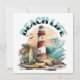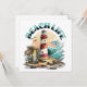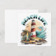 Casa de playa 'Tarjeta de arte en blanco. ¡Prepararlo o enviarlo! Ilustracion de una escena de playa con faro, tablas de surf, palmeras y delfines.