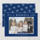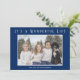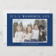 Envía alegría navideña con estas tarjetas de Navidad minimalistas. Un diseño moderno y simple que incluye la foto de tu familia y el mensaje "Es una Vida Maravillosa" en blanco sobre un fondo azul marino. La parte trasera tiene copos de nieve blancos sobre un fondo azul marino. Puedes cambiar el color del texto y los colores de fondo haciendo clic en el botón "personalizar".