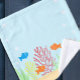 Vida marina con peces naranjas y azules jugando entre arrecifes de coral y algas, en medio de burbujas oceánicas.