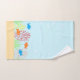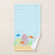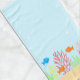 Vida marina con peces naranjas y azules jugando entre arrecifes de coral y algas, en medio de burbujas oceánicas.