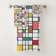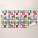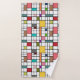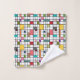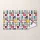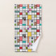 Este conjunto de toallas tiene un diseño moderno de mediados de siglo de una cuadrícula de líneas negras con cuadrados y rectángulos de colores retro sobre un campo de blanco.