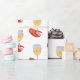 Papel envuelto decorado con un ilustracion colorido de una garra de bogavante alrededor del tallo de una copa de vino blanco. Pintura: Lápiz de color. Copyright Dominic A. White.