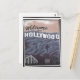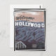 Postal de Hollywood de época. Diseño de periódicos de antiguos colores, con Hollywood Hill y texto "Bienvenidos a Hollywood".