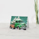 Viejo camión verde con un árbol de Navidad cubierto de nieve por la espalda.