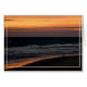 Dos niños se paran al borde del surf para ver el amanecer sobre el océano.