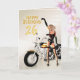 Un chica con una motocicleta que señala en el mensaje del feliz cumpleaños. ¡Una gran tarjeta para el hombre que ama sus bicis!