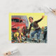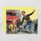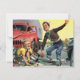 Ilustración antigua de niños que presenta a un estudiante que trabaja como oficial de patrulla de seguridad actuando como guardia de cruce deteniendo autos para ayudar a una niña que ha dejado caer su almuerzo en el cruce de peatones en su camino a la escuela en la mañana. Está recogiendo una manzana con una mano y deteniendo el tráfico con la otra. Un conductor en un camión semi espera pacientemente.