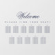 Una simple tabla de asientos transparente con 11 mesas, recomendada para un boda azul marino, pero utilizable también en otras ocasiones. Se trata de un revestimiento de una ventana, que se colocará sobre una ventana u otra superficie transparente de vidrio o acrílico. Todo el texto es azul marino. La palabra Bienvenida está escrita en un guión caligráfico elegante, el resto en mayúsculas. Las mesas se reparten en 2 filas. Encima de ellos y bajo la palabra Bienvenidos, está el mensaje "¡Por favor, encuentren su asiento!".
