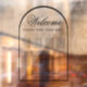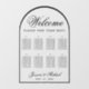 Una simple tabla de asientos boda transparente dentro de un marco de arco moderno. El texto y el marco son negros. El Bienvenida y los nombres están escritos en una elegante caligrafía.