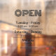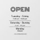 Este cling está diseñado para ayudar a las empresas a dar a conocer sus horarios de apertura a clientes potenciales. Es una forma fácil para los clientes de averiguar rápidamente a qué hora está abierto el negocio y cuándo pueden esperar encontrarlo abierto.