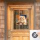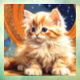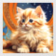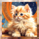 Ventana con gatito naranja al estilo Art Nouveau de Alphonse Mucha. Este lindo gatito con ojos azules adorablemente te mira contra el telón de fondo de un cielo nocturno lleno de estrellas. ¡Un regalo maravilloso para los amantes del gato y de los coleccionistas Art Nouveau!