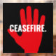 Alto al fuego blanco negro mano negrita personalizado texto anti ventana de guerra signo de cierre. Texto blanco, mano roja, fondo negro. Texto de personalizable completo. Conflicto entre Oriente Medio y Gaza.