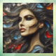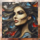 Retrato de una mujer hermosa que exuberaba arrogancia en un estilo abstracto. La técnica del vidrio manchado emplea líneas de oro artísticas, combinando los colores rojo, naranja, azul y carbón vegetal. Sus cascadas de cabello como las olas en el océano, agregando un toque de vibrante elegancia a esta fascinante representación de la confianza.