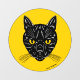 A retro-looking illustration of the face of a yellow-eyed black cat appears in a moon-like circle in this original Halloween-appropriate art by Richard H. Fay.