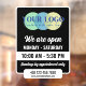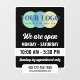 Put this open hours decal on your storefront to let customers, clients, and passers-by know when you're open and how to contact you. Personalize with your business logo, phone number, and website. The open hours window cling has a clear and modern design in white and black to be easily read and eye catching.
