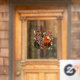 El panel de revestimiento de ventanas con temática de bosques de otoño incluye zorro y batidor con hojas, bayas, setas y bellotas sobre fondo gris claro.