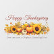 Esta pegatina para ventana de la fiesta de vacaciones de la empresa con estilo antiguo presenta un dibujo vintage de calabazas naranjas, hojas de otoño y girasoles otoñales lindos. Impresión nostálgica de Feliz Día de Acción de Gracias con escritura marrón con el nombre de su empresa y mensaje profesional personalizado en la parte posterior para clientes y amigos.