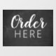 Este personalizado comercial negro de la señal de la camioneta de comida en tiza puede mantener su mensaje personalizado. Personalice la edición de este signo de orden personalizado Here (Orden aquí) que incluye un falso signo de tiza negra con escritura manuscrita blanca y fuente moderna.
