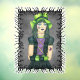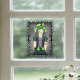 Este revestimiento de ventana tiene un espeluznante chica de bonito con telaraña y tatuajes de luna morada usando un gorra verde brillante con un marco de ramas negras.
