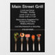 Anuncie la información de negocios de su restaurante con un moderno revestimiento de ventanas. Este revestimiento de ventana presenta una moderna "comida" en las tenedores de Oneida con un fondo negro. Usa mi foto para promocionar tu negocio o editarlo para añadir tu logotipo de negocio. Personalice esta plantilla con la información de su empresa.