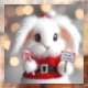 La imagen retrata una escena festiva con un conejo blanco como protagonista principal, vestido adorablemente con un traje de Santa Claus rojo. El conejo sostiene un bastón de caramelo en una pata y un cartel que dice "feriados de vacas" en la otra. El telón de fondo es borroso y tiene luces cálidas y brillantes que imparten un ánimo de celebración y alegría por las vacaciones.