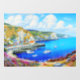 "Devon Harbour Dreamscape" - Un paisaje marino inglés. Una acuarela estilizada de una visión costera radiante donde colinas verdes onduladas se encuentran con las brillantes aguas azules de un puerto pacífico. Los barcos descansan sobre el ancla, mientras que las casitas de campo encaladas con tejados de color ocre se esconden contra el paisaje. Las nubes florecen sobre la cabeza como esculturas pintadas, y las flores brillantes en primer plano agregan vitalidad, creando una celebración de ensueño de la costa inglesa.