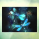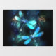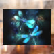 Dos libélulas transparentes, luminosas, turquesas, dibujadas de forma artística sobre el fondo nocturno con algas lacustres luminosas y luciérnagas. Flauta de dragón resplandeciente.