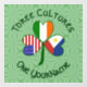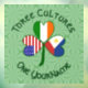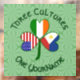 Shamrock diseñado para celebrar festividades filipinas, feriados irlandeses, como el Día de San Patricio, y festividades de EEUU, como el Día de la Independencia o el 4 de julio. El shamrock tiene una bandera diferente en cada hoja. Una para Filipinas, otra para Irlanda y otra para los Estados Unidos de América. Las palabras de arriba dicen TRES CULTURAS. Las siguientes palabras son ONE YOURNAME. Agregue su nombre en el lugar adecuado para una apariencia personalizada. Para un regalo personalizado, simplemente agregue el nombre de otra persona. Las palabras se muestran en verde oscuro, estilo celta, letras circulares. El fondo son cuadrados verdes y claros.