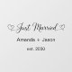 Make your just-married status a sweet statement with our "Just Married Hearts" black script Window Cling. This fun car window sticker adds a touch of elegance to your celebration, featuring a beautiful script font decorated with heart tails. Place it on the back of your car, and let the world know about your special milestone in the most stylish way.