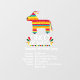 Invitación festiva para el Cinco de Mayo o cualquier evento con tema mexicano: un burro piñata arcoíris en un lado y arte popular mexicano con guitarras y pimientos en la parte posterior.