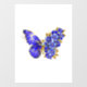 Joyería, azul, zafiro, mariposa floral brillante con ala decorada con flores azules y preciosas con hojas de oro sobre fondo blanco.