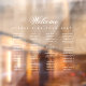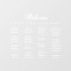Un sencillo cuadro alfabético transparente con 4 columnas, recomendado para un boda, pero que también se puede utilizar en otras ocasiones. Se trata de un revestimiento de una ventana, que se colocará sobre una ventana u otra superficie transparente de vidrio o acrílico. Todo el texto es blanco. La palabra Bienvenida está escrita en un guión caligráfico elegante, el resto en mayúsculas. Los nombres se ordenan alfabéticamente en 4 columnas. Encima de ellos y bajo la palabra Bienvenidos, está el mensaje "¡Por favor, encuentren su asiento!".