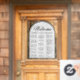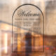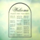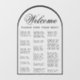 Una simple tabla alfabética transparente dentro de un marco de arco moderno. El texto y el marco son negros. El Welcome está escrito en una elegante caligrafía. Los nombres están en 3 columnas.