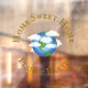 Este es un ilustracion encantador de nuestro planeta de origen en una mortaja de nubes blancas onduladas en un universo estrellas brillantes y las palabras "Hogar, dulce hogar, planeta Tierra".