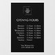 Mantenga informados a sus clientes con esta elegante pegatina de horarios comerciales en negro. Personalizable con su logotipo, es perfecta para tiendas, cafeterías, salones de belleza y oficinas. Duradera, fácil de aplicar y profesional, es una forma ideal de mostrar sus horarios de apertura y cierre en cualquier fachada de tienda.