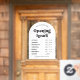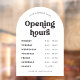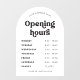 Diseño retro de horas de apertura de negocio con plantilla de decalcomanía de ventana con arco blanco y fuente de estilo nostálgico. Este letrero editable de horas de apertura incluye espacio para el nombre de su empresa, horarios de funcionamiento y detalles de contacto. Muestre sus días y horas de apertura en la ventana de su tienda con este letrero de vinilo de horas de apertura - se puede utilizar para su café, restaurante, salón o cualquier otro negocio.