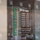 Calcomanía comercial de horas de apertura modernas en blanco y verde para las ventanas o la puerta de su tienda con horas de apertura, sitio web, redes sociales y número de teléfono en un diseño minimalista limpio y fuentes verdes y blancas. Sin logotipo.