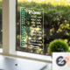 Calcomanía comercial de horas de apertura modernas en blanco y verde para las ventanas de su tienda o puerta de la tienda con horas de apertura, sitio web, redes sociales y número de teléfono en un diseño minimalista limpio y fuentes verdes y blancas. Sin logotipo.