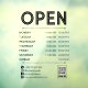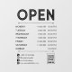 Decal de negocio de horas de apertura modernas y prácticas en negro para las ventanas de tu tienda o puerta de la tienda con horas de apertura por día, tu número de teléfono, redes sociales y sitio web junto a iconos blancos, y un código QR que tus clientes pueden escanear para acceder fácilmente a tu presencia en línea. Todo el texto es personalizable.