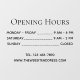 Una simple y transparente vinilo de horas de apertura. Todo el texto es negro. Debajo de las horas de apertura, está el número de teléfono y sitio web.