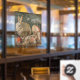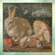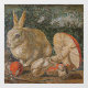 Mosaico antiguo y vintage de un conejo con champiñones. Un hermoso animal de bosque y una imagen de planta.