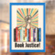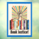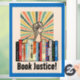Protesta prohibiendo libros con esta imagen que muestra una estantería de libros prohibidos, un puño levantado en protesta, un estallido de rayos de color y las palabras "Justicia del libro" en un tipo de letra retro. Acentuado por un borde de azul rico. ¡Parece genial!